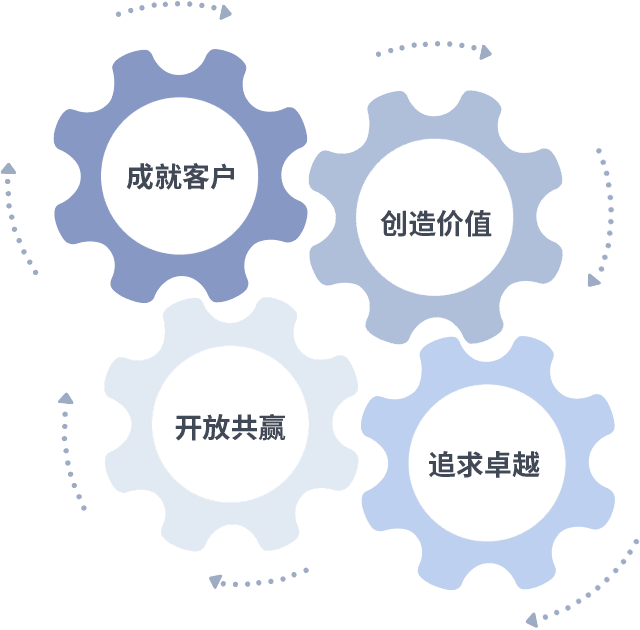 成就客户是一切决策的出发点,,创造价值是衡量所有工作的标准,,追求卓越是我们做事做人的态度,,,开放共赢是我们的格局也是最终的结果。。。。价值观的齿轮环环相扣,,推动着组织里的每个人不断向前。。。。